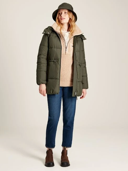 If you’re looking for a sporty-style statement coat to keep you warm in the colder months, let us introduce you to the Holsworth padded coat. It has faux down padding and jumbo baffles for maximum comfort, and our designers have cleverly added an adjustable waist so it can be cinched in. It has a buttery soft hand feel with a pearlised finish, and is showerproof making it ideal for light bursts of rain. We’ve included a detachable hood and two fleece lined pockets to keep your hands toasty on chilly days. Showerproof Jumbo baffles with faux down padding Adjustable waist with bungee toggles Detachable hood Zip fastening Fleece lined pockets Pearlised finish Branded rubber badge to the arm Joules hare embroidery to the hem Length: 81cm (based on UK size 12)