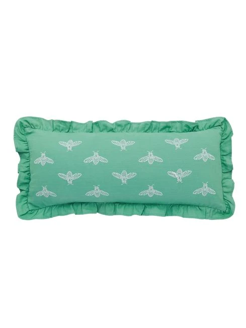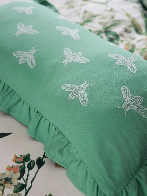 Bring the buzz of nature into your home with this filled cushion. A colony of bees have been lovingly embroidered onto the soft green cotton cushion. It has a plain dye reverse and is finished with a pretty ruffled trim. Pair it back with the Lakeside Floral bedding set or use as a statement for your sofa.