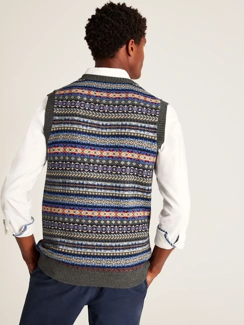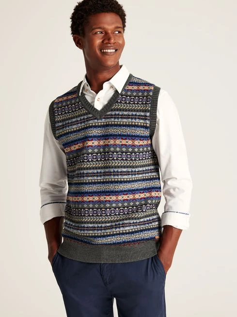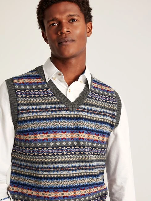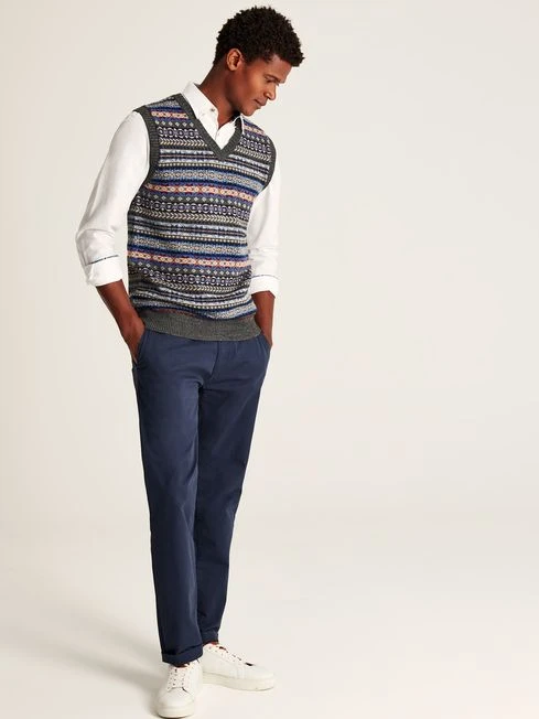 Here’s proof that you can’t beat a classic. Our heritage-inspired Fair Isle knitted vest is best worn over a crisp Oxford shirt for a layer of warmth when the occasion calls for it. Crafted from a soft yet hardwearing cotton blend, it has a traditional ribbed-V-neck as well as a ribbed hem and armholes. As an extra premium detail and unmistakable mark of quality, we’ve added a faux-leather Joules branded patch above the hem. Cotton blend Fair isle pattern V neck Ribbed neck, hem and armholes Faux leather branded tab