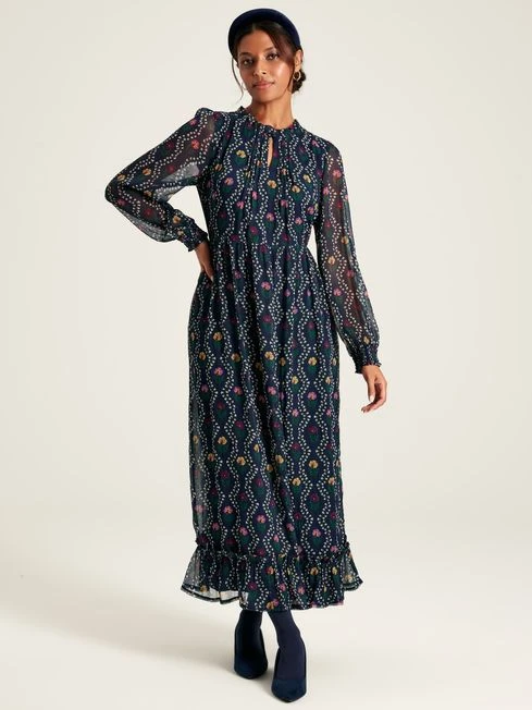 The Helena dress will carry you effortlessly through the autumn and winter months. This transitional number is crafted from light and drapey viscose georgette, has a full lining to the body and sheer blouson sleeves with smocked cuffs. It falls to a maxi length with a peplum hem. Details galore, such as a pleated bodice, frilled neckline with keyhole button fastening, a frilled trim to the hem and a new season floral print, tranform it into a true conversation starter. Pockets to the side seams and an invisible zip to the centre back completes it to perfection. Viscose Georgette Maxi length Full viscose lining Peplum hem with frill detailing Long sheer sleeves with smocked cuffs Pleated detail to the bodice Round neck with frilled trim and keyhole button fastening Pockets in the side seams Invisible zip to the centre back Length: 138cm (based on UK size 12)