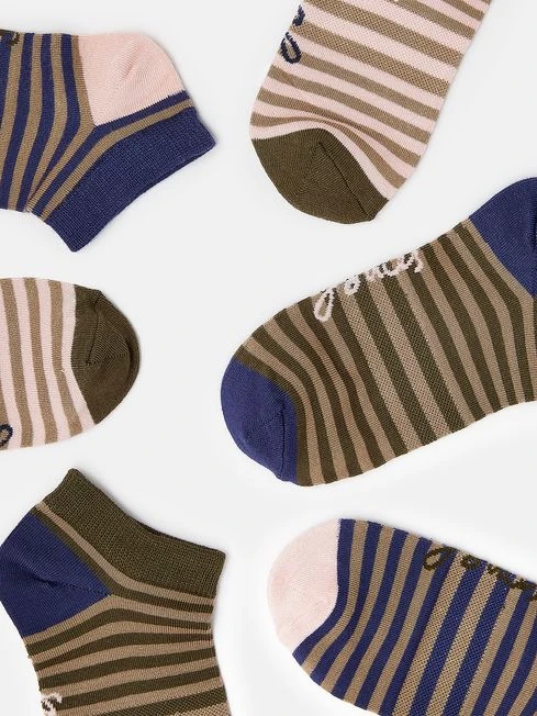 Crafted from light and airy viscose, this pack of three trainer socks make for a comfy, everyday essential. Each pair features a striped design with contrasting heel and toe. They also make a great gift for anyone who is always losing their socks. Viscose Trainer socks Pack of three Striped Contrast heel and toe Intarsia Joules script to the sole