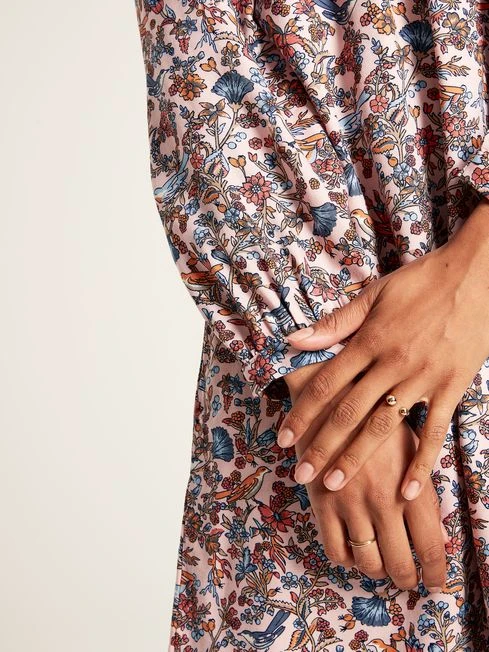 Carrying an intricately hand-drawn print, the Savannah dress will be your favourite piece by far. Birds perch amongst blooms in this high-coverage print which uses an opulent colour palette sure to elevate your wardrobe. It sits on the knee, and has long gathered sleeves, a notch neck and side pockets. Cold weather? No problem. Reach for a cosy knit and leather boots for a layered-up look. Viscose Long sleeves with gathered sleeve head Notch neck Sits on the knee Pockets in the side seams Hand-drawn print Length: 100cm (based on UK size 12)