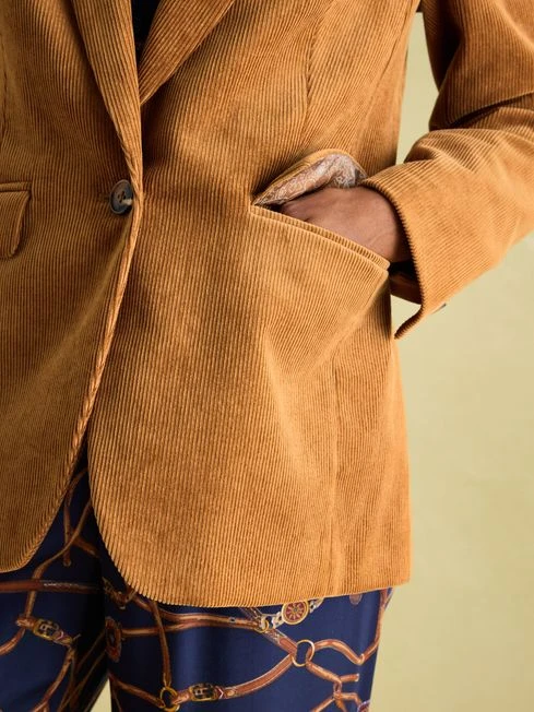 You can finish off your outfit with a quintessentially British flourish thanks to our heritage-inspired Holton blazer. Made from a classic cotton cord, it features a single button fastening at the waist with curved seams to create a slim, tailored fit. It has button cuffs, two flap pockets to the front and a handy hidden pocket to the inside. The silky polyester lining has a vintage paisley print. Cotton corduroy Flap pockets Faux horn buttons Single button fastening Button cuffs Felt collar stand Paisley printed lining Slim, tailored fit Length: 72cm (based on UK size 12)