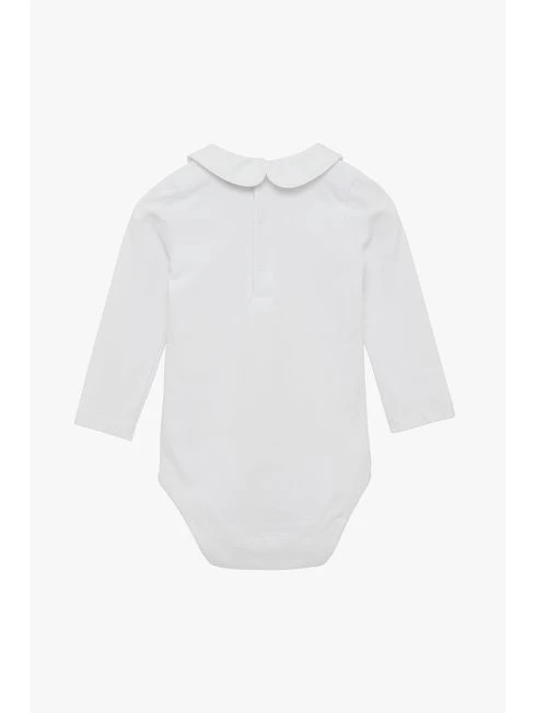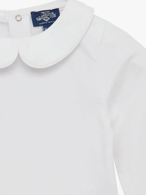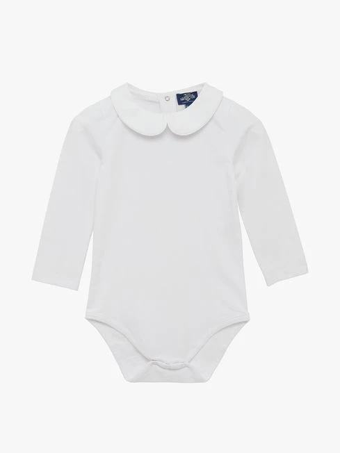 Made from soft jersey this Milo body has a Peter Pan collar trimmed with smart white piping detail. Team this staple with our dungarees and bib shorts to complete the look. It fastens with poppers at the centre back and along the leg seams for easy dressing.