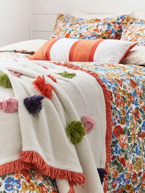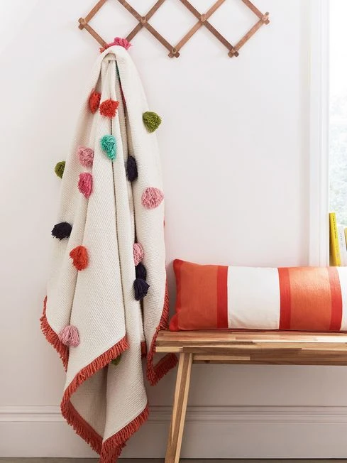 Whether you drape it over the back of the sofa or add it to your bedding, this oversized throw will make a beautiful addition to your home. It’s been lovingly hand-woven and tufted which gives it a real sense of craftsmanship. Large tasselled pom poms scatter the crĂšme background adding an uplifting pop of green, pink, blue, navy and red. A fringed coral trim finishes it off perfectly.